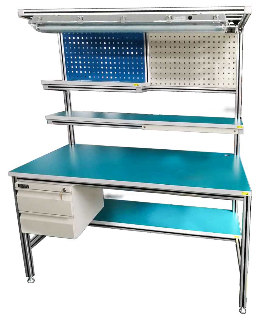 鋁合金工作臺人性化設計,符合人體工程學原理,提高生產效率模塊化設計,多種附件可視需要任意組合,且具有互換性;標準化設計,防靜電工作臺、鋁合金工作臺可根據不同要求,定制您所需產品;高品質臺面,具有防靜電/防火/耐磨等性能;鋁合金工作臺高低可調節,適合您的使用需求;支撐采用鋼結構設計,堅固耐用,可均勻承載500kg;整體防靜電,從根本上杜絕潛在靜電對產品的威脅。
