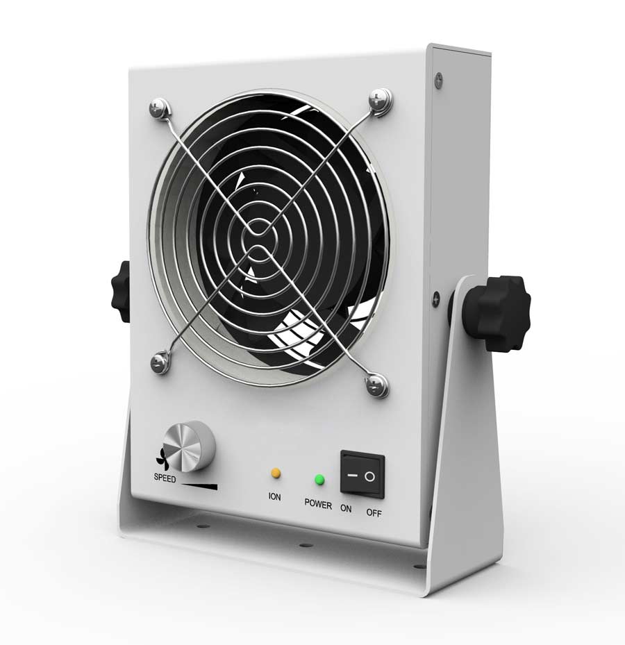 臺式離子風機采用正、負同步發射電極,通過直流高壓產生電暈放電,將空氣分子電離,產生大量正、負極性的空氣離子,并由風扇將其吹向被消物體表面進行靜電消除??蓮V泛應用于電子、光電等行業。