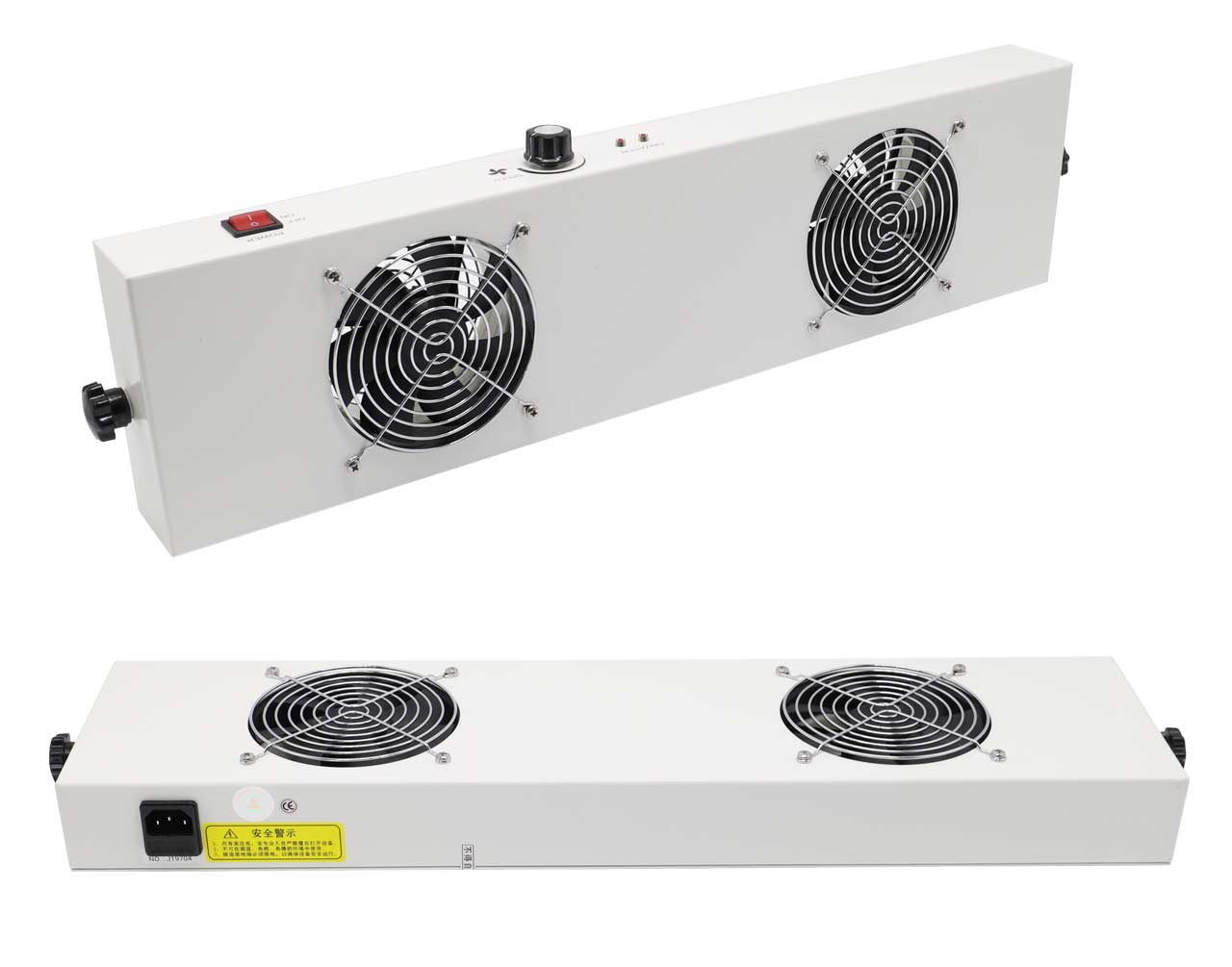 自清潔懸掛式離子風機采用正、負同步發射電極,通過直流高壓產生電暈放電,將空氣分子電離,產生大量正、負極性的空氣離子,并由風扇將其吹向被消物體表面進行靜電消除。