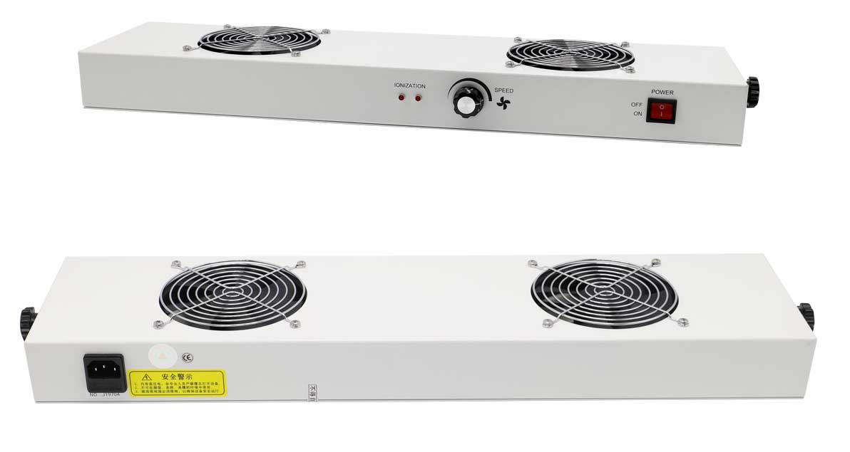 自清潔懸掛式離子風(fēng)機采用正、負同步發(fā)射電極,通過直流高壓產(chǎn)生電暈放電,將空氣分子電離,產(chǎn)生大量正、負極性的空氣離子,并由風(fēng)扇將其吹向被消物體表面進行靜電消除。